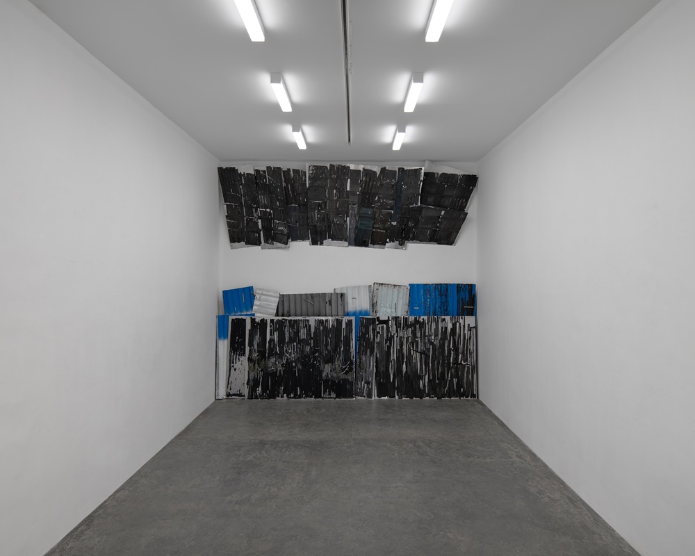 In this series, she paints with wood stain, automotive paint, oil and alkyd paint on pre-cut aluminum sheets whose mechanical shapes guide each composition. Unframed for the first time, the works extend into the surrounding space, becoming fragments that express sequence and repetition within the broader concept of “place.”